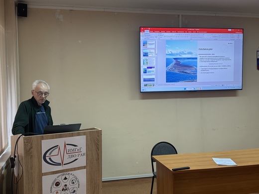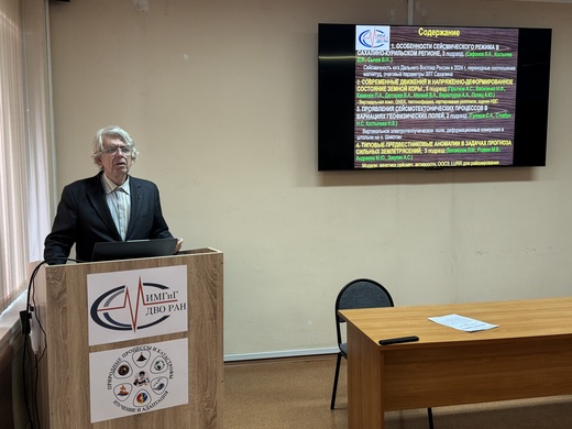Рабочая часть продолжилась представлением промежуточных научных отчетов. Леонид Михайлович Богомолов доложил о результатах по теме государственного задания «Сейсмотектонические процессы и их проявления в вариациях геофизических полей в Сахалино-Курильском регионе».