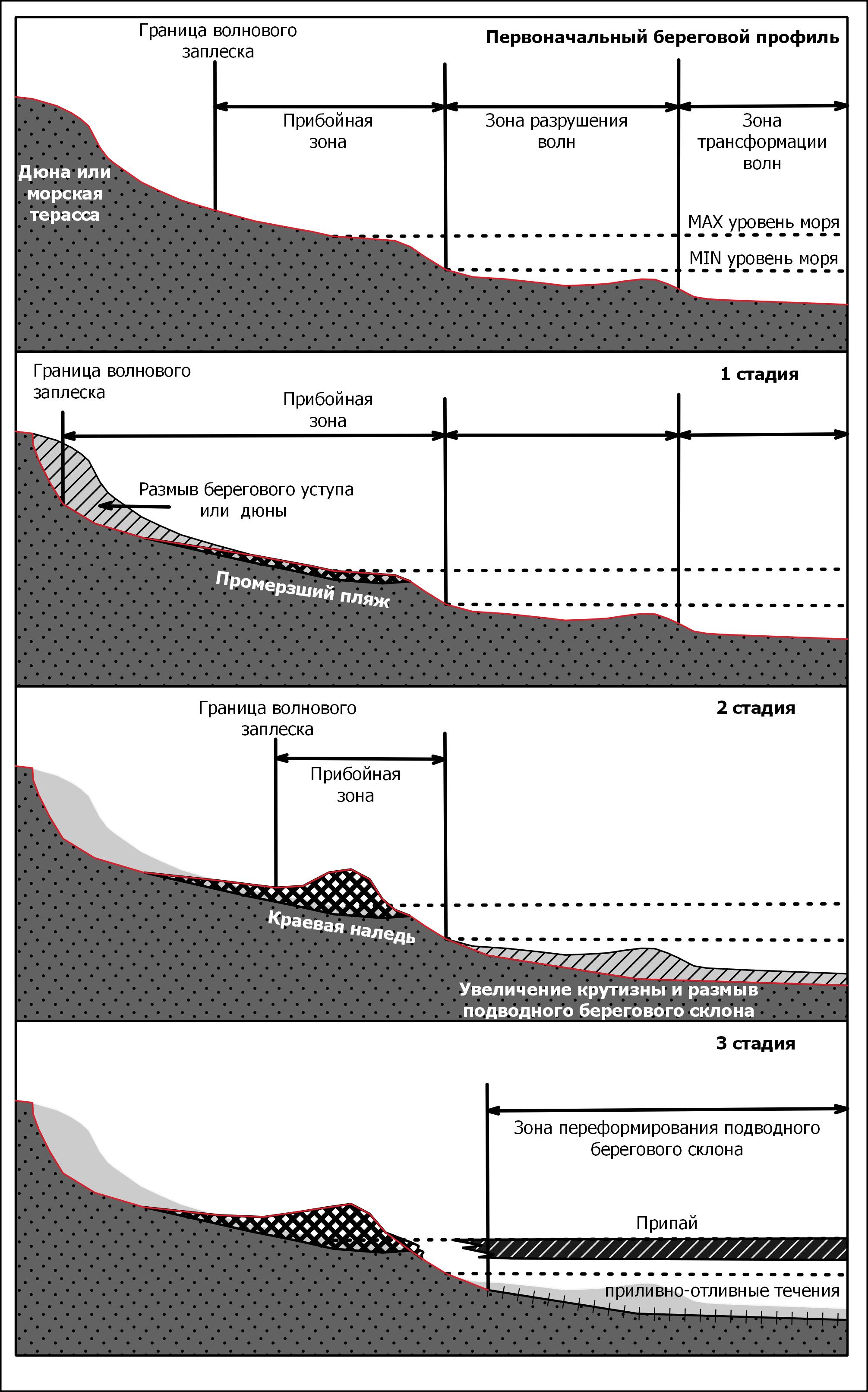 - Выявлены ранее не известные особенности морфолитодинамики берегов субарктических и умеренно-холодных морей. Выделено три последовательные динамические стадии развития берегов в осенне-зимний период(рис). Показано, что период максимальной опасности разрушения берегового уступа начинается при промерзании пляжа и ухудшении вследствие этого его волногасящих свойств и заканчивается формированием наледи и припая. Продолжительность этого периода на разных берегах визуализирована картой.