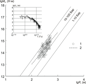 Распределение скалярного сейсмического момента (M0) в зависимости от размера очага (R) для сахалинских землетрясений (1) и аппроксимирующая связь (2). Во врезке изображен пример рассчитанного амплитудного спектра смещений SH-волны и его аппроксимации согласно модели Бруна.