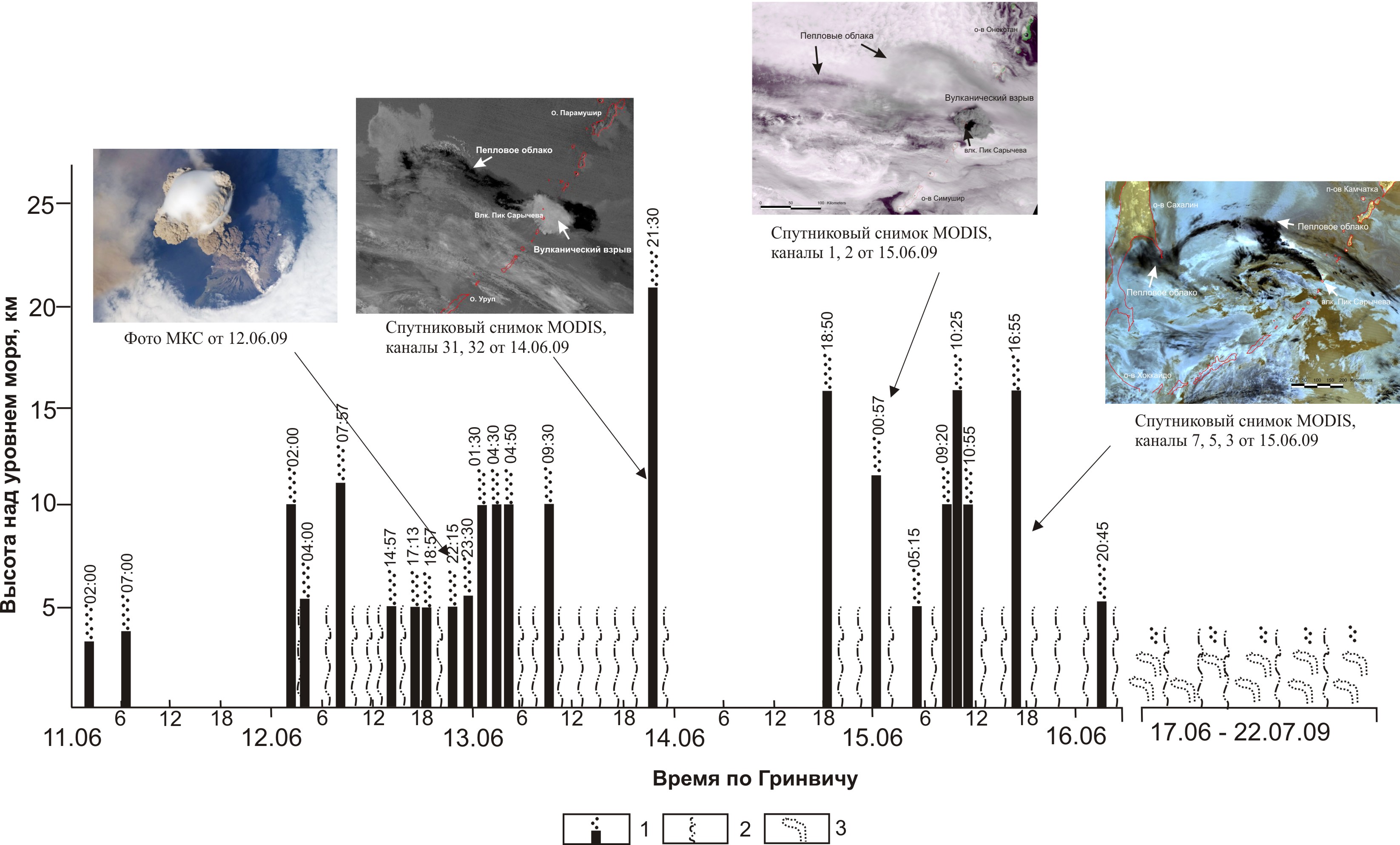 Хронология извержения вулкана Пик Сарычева в июне 2009 по данным дистанционного зондирования.