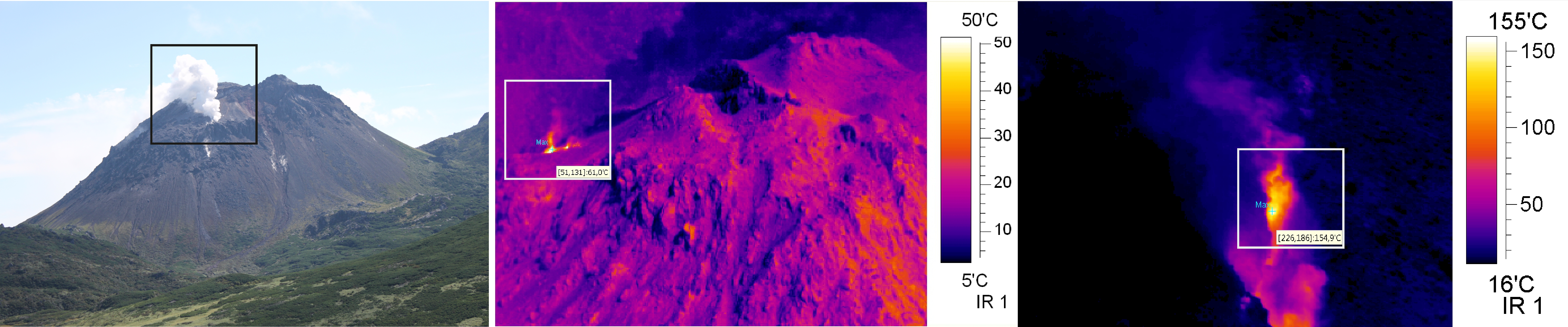 Фото (слева) и термограммы (справа) экструзивного купола вулкана Иван Грозный, 2012 г.
